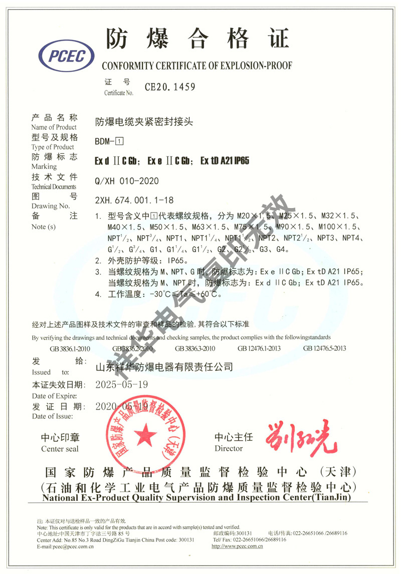 防爆电缆夹紧密封接头 BDM-□ 防爆合格证