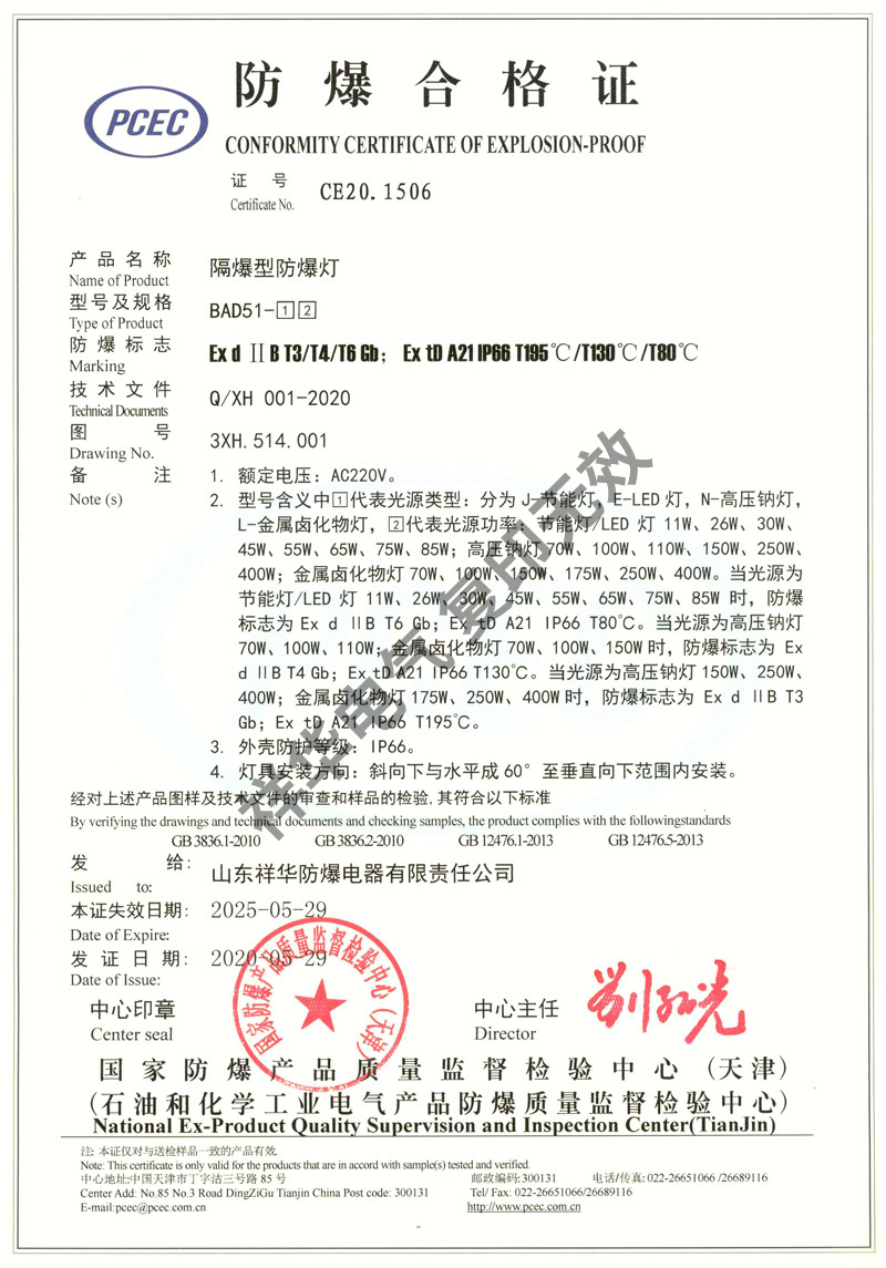隔爆型防爆灯 BAD51-□□ 防爆合格证